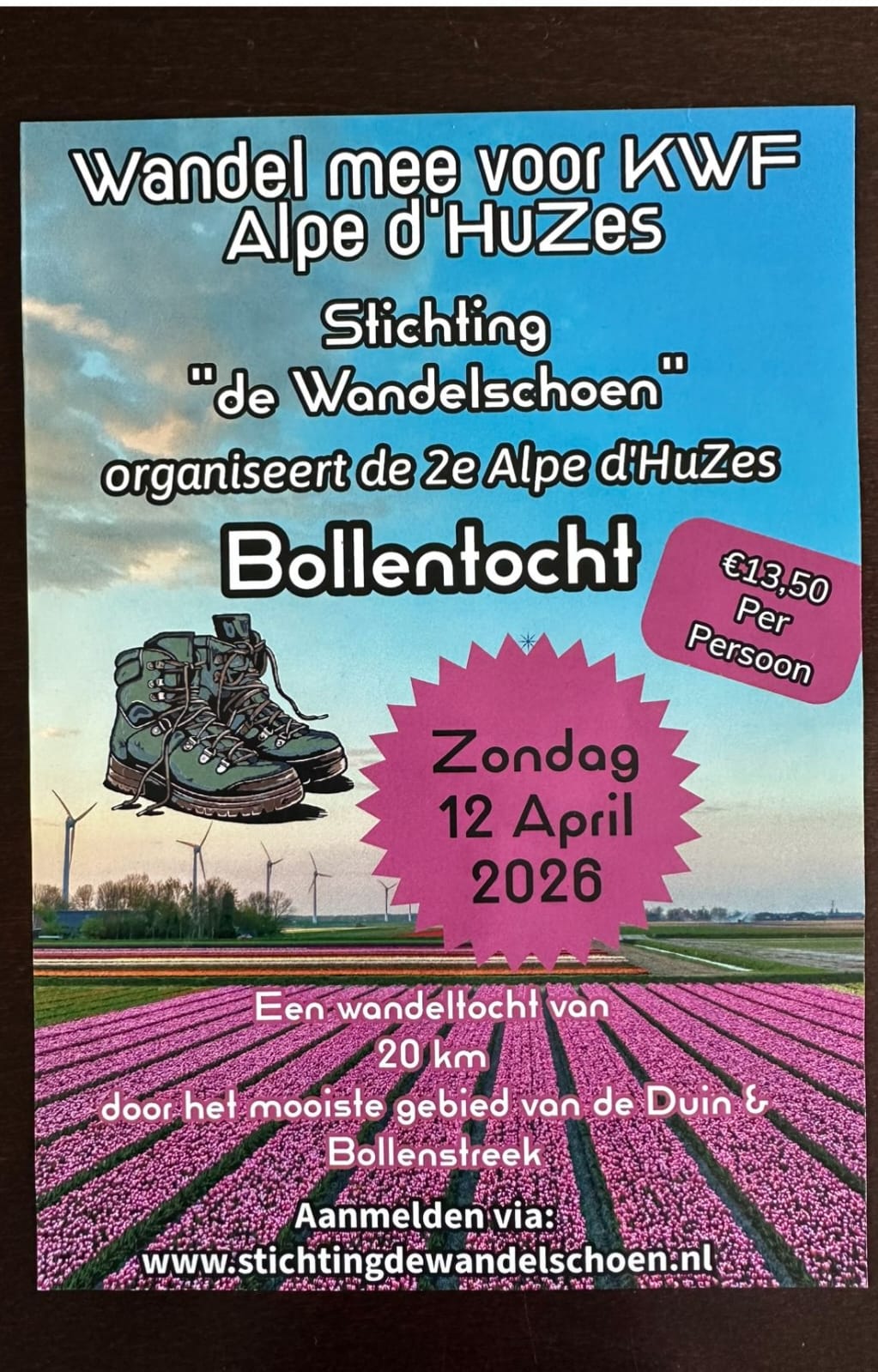 Stichting de Wandelschoen, organiseert op zondag 12 april 2026, de 2e Alpe d’HuZes Bollentocht. Een wandeltocht langs en door de mooiste bloembollenvelden van de bollenstreek.